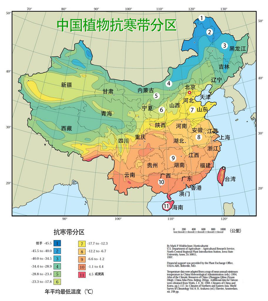 原品種作為雞爪槭的變種,可適應最低-20℃的低溫,種植范圍廣,北至京津冀,南至湖北、四川、貴州等地(如圖7區(qū)﹣9區(qū))。其冬季雖然落葉,但枝條亦能呈現(xiàn)紅色,所以,金禧非常適合在黃河以北,例如說北京,作為城市色塊產(chǎn)品的補充,為北方單調(diào)的色塊增彩添色。